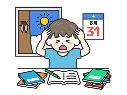夏休み最終日|宿題に追われて頭を抱える、小学生の男の子のイラスト
