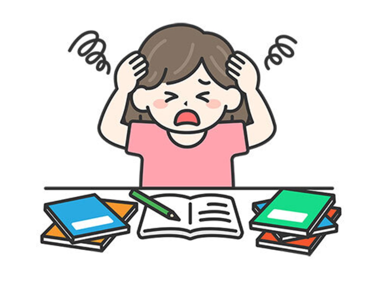 テスト前日|試験勉強に追われて頭を抱える、女性のイラスト
