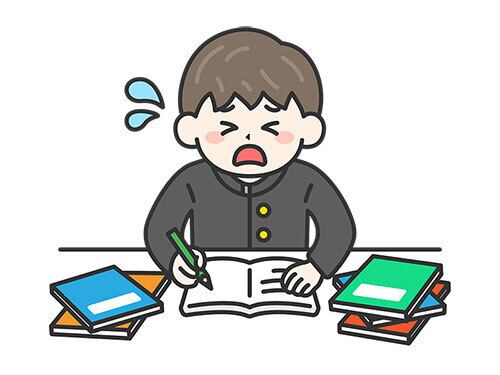 テスト前日|焦りながら試験勉強をする、学生服を着た男性のイラスト