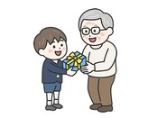 敬老の日に、祖父にプレゼントを渡す、制服を着た男の子のイラスト|敬老の日