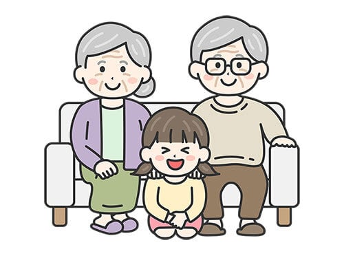敬老の日に、ソファで祖父母と写真を撮る、女の子のイラスト|敬老の日
