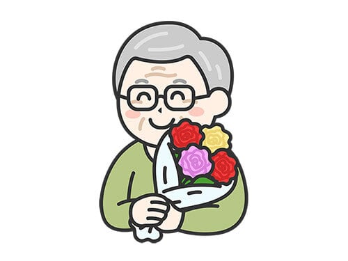 敬老の日に、花束をプレゼントされた、笑顔の祖父のイラスト|敬老の日