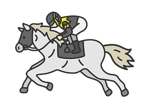 横から見た、走っている、マスクをした芦毛の競走馬(線画カラー)のイラスト