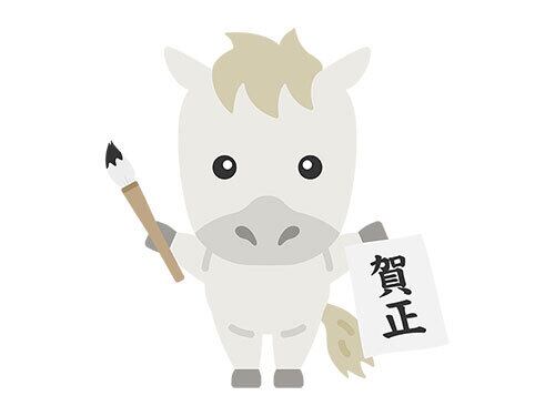 新年の書き初めをする、白馬のキャラクターのイラスト|午年