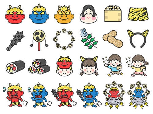豪華版!節分のスペシャルアイコン(線画カラー)のイラストセット