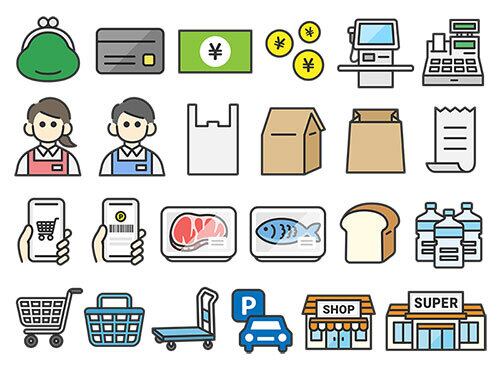 いろいろな、スーパーマーケット関連のアイコン(線画カラー)のイラストセット