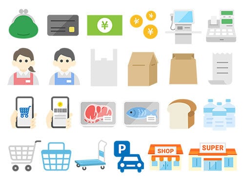 いろいろな、スーパーマーケット関連のアイコンのイラストセット