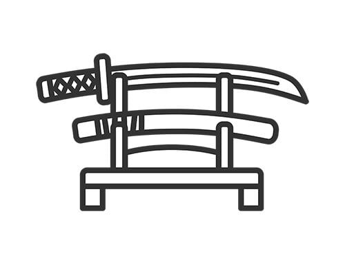 刀掛台に飾られた、日本刀と鞘のアイコン(線画)のイラスト