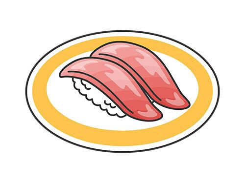 回転寿司の皿にのせた、マグロのトロの寿司のイラスト(eps+pngデータセット)