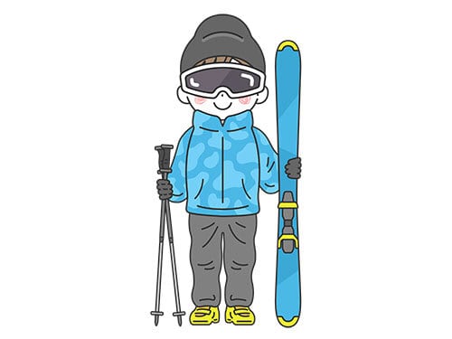 ゴーグルをつけて、スキー板とストックを持った、男性のイラスト
