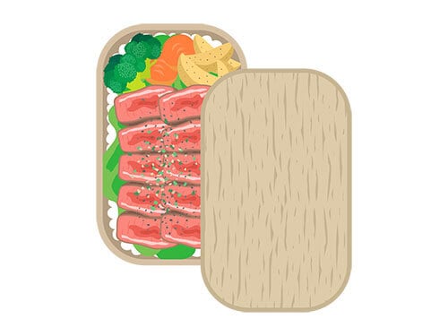 曲げわっぱ弁当箱に入った、ステーキ弁当のイラスト