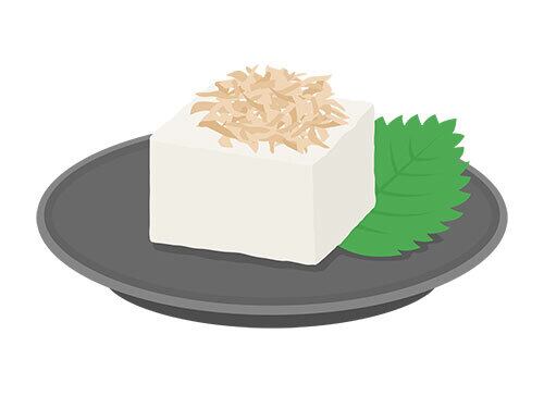 皿に盛られた、かつお節をかけた、豆腐のイラスト