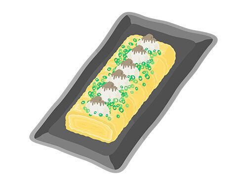 皿に盛られた、大根おろしと葱をのせた、だし巻き卵焼きのイラスト