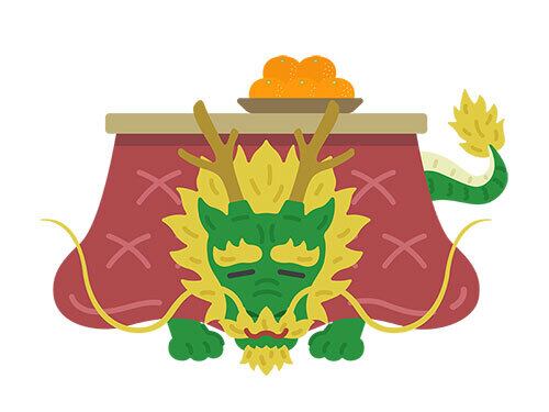 こたつに入ってくつろぐ、龍のキャラクターのイラスト