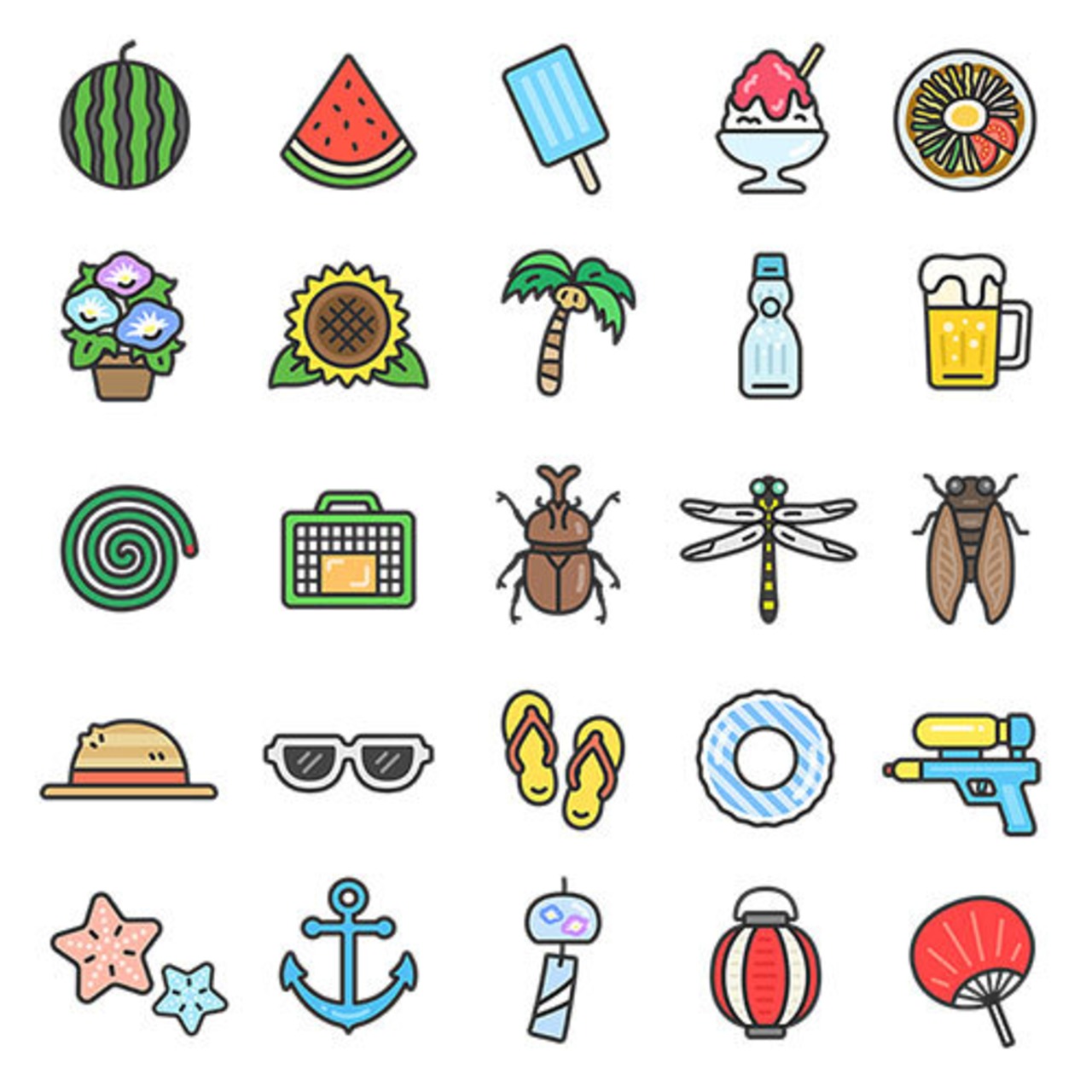 夏のアイコン(線画カラー)のイラストセット