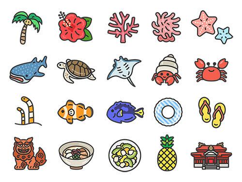 いろいろな沖縄のアイコン(線画カラー)のイラストセット