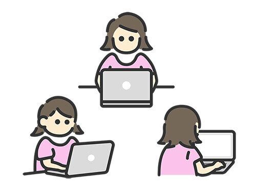 ノートパソコンを使う女性のアイコン(線画カラー)のイラストセット